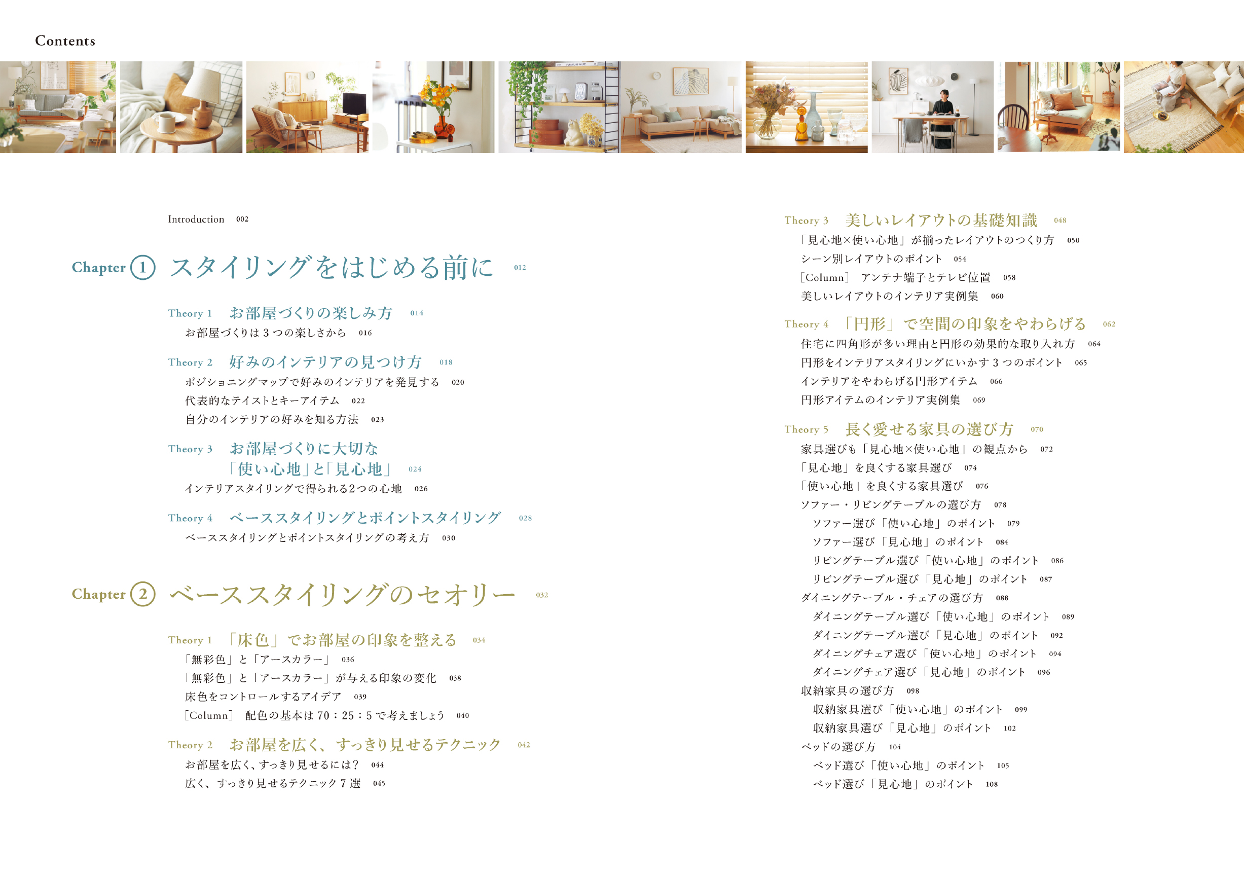 ページの構成は、①スタイリングをはじめる前に、②ベーススタイリングのセオリー、③ポイントスタイリングのセオリーとなっています。初心者の方でも、基礎から学んでいただけるように、インテリアの基本を丁寧に紐解きながら、前著よりも実践アイデアをたくさんご紹介しました。