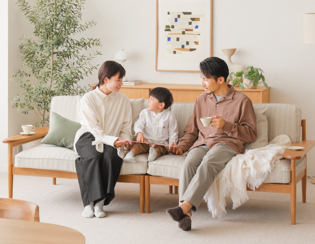 奥行きにゆとりのあるソファーは、深く腰掛けてくつろぎたい方にぴったり。足を上げてゆったり座ったり、お子様を膝に乗せて過ごしたり。家族での団らんの時間にも、やさしく寄り添います。