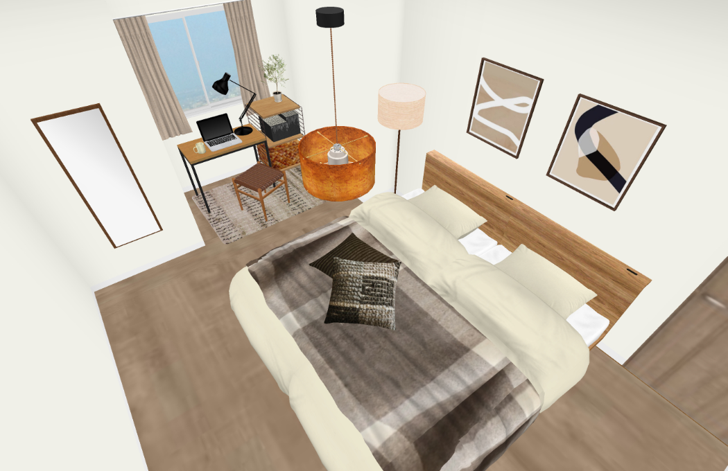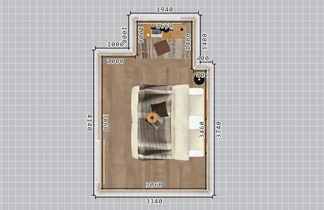 スペースを有効活用し、ベッドはシングルサイズを2台並べたワイドキングサイズにて配置いたしました。