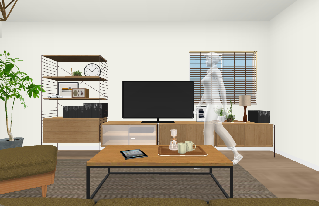 壁面収納の前には、ご希望のNOANAソファーを含めたリビングアイテムを配置しております。