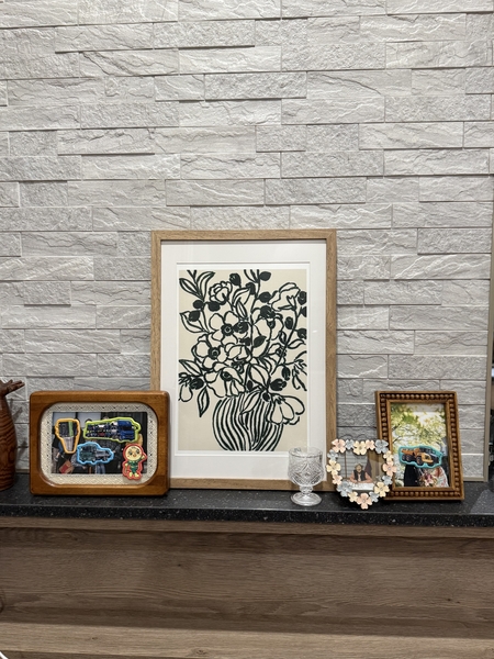 立体的な雑貨の中に、平面のアートを1つ取り入れることで、ディスプレイがワンランクアップします。