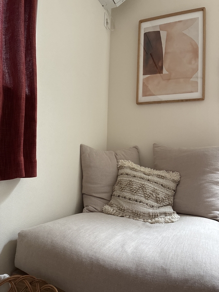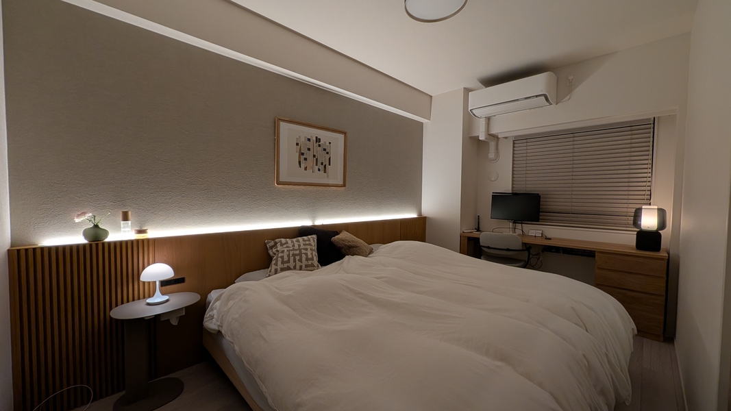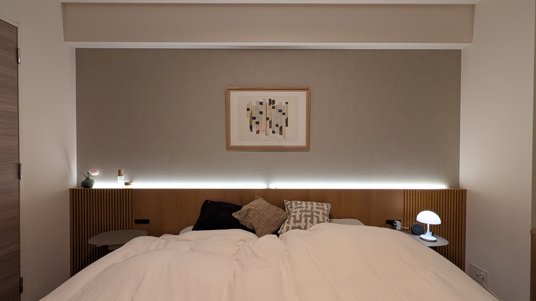 角が丸く背面のシーグラスや無垢の質感がとても優しく、寝室のナチュラルな木材素材と統一感ができ、ぐっと洗練された空間となりました!