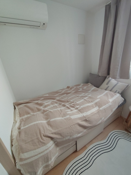 そんなベッドに、Lyme Grassを広げました。その淡いカラーは、涼しげな印象で春夏にぴったり。パッと寝室が華やぎます。