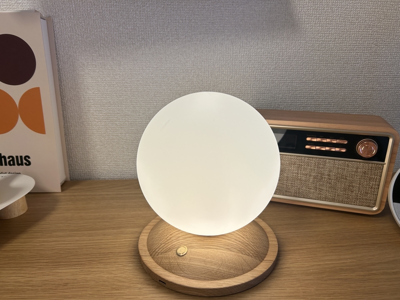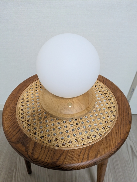 まんまるのシェードと、木のぬくもりを感じる台座の美しさも特徴です。