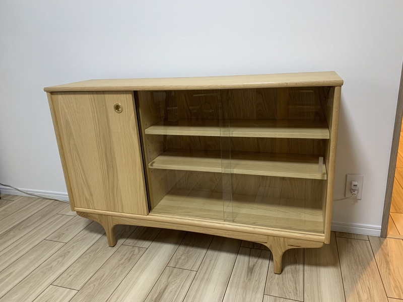 こちらは「3ドアサイドボード」と同じサイズですが、3枚の扉のうち1枚をガラスにしています。