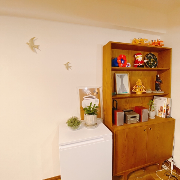 棚上には、アートを合わせたり、オブジェや花瓶を