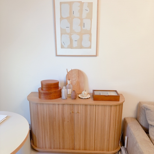 大抵の場合、キャビネットの横顔は、四角く無表情なものが多く、角が立った姿は、美しさが減るとともにお部屋に感じる緊張感の原因にもなります。