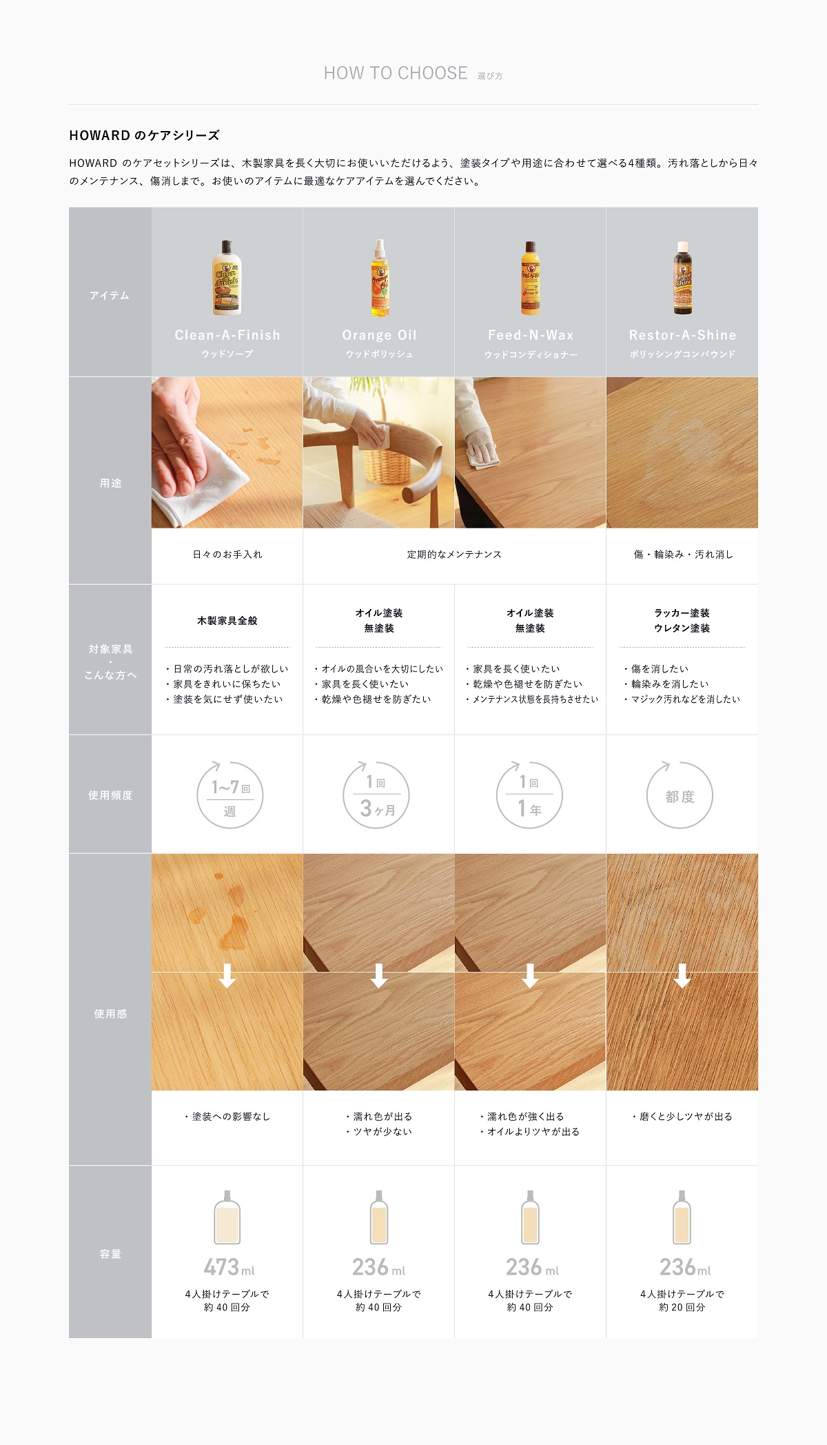 クリーナー、オイル、ワックス、キズ消し(コンパウンド)と用途に合わせてお選びいただけます。定期的にお手入れを行い、大切な家具を長くご愛用ください。