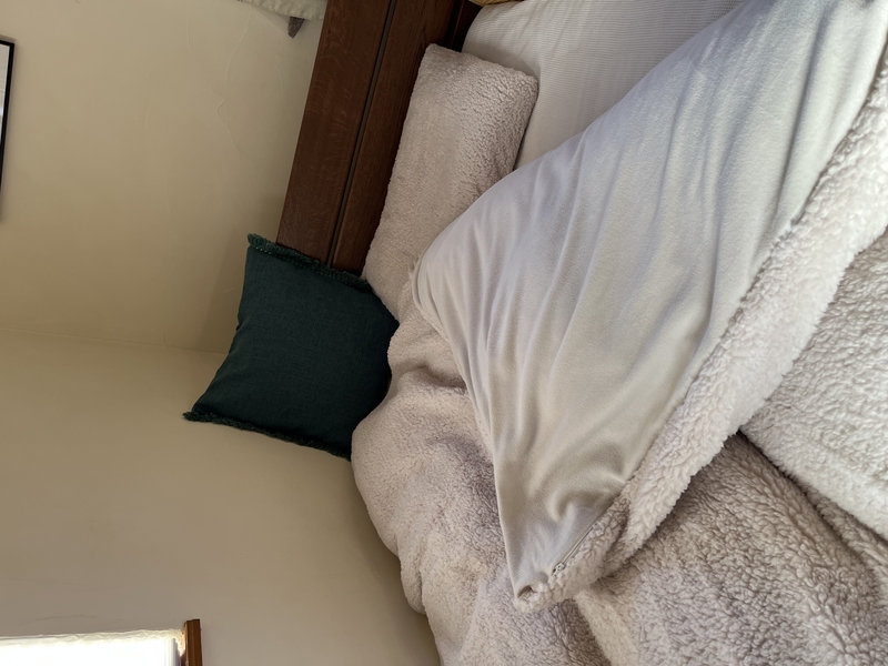 ちなみに、シングルベッドにセミダブルサイズのお布団をあわせていただくと、お布団の裾に余裕ができます。