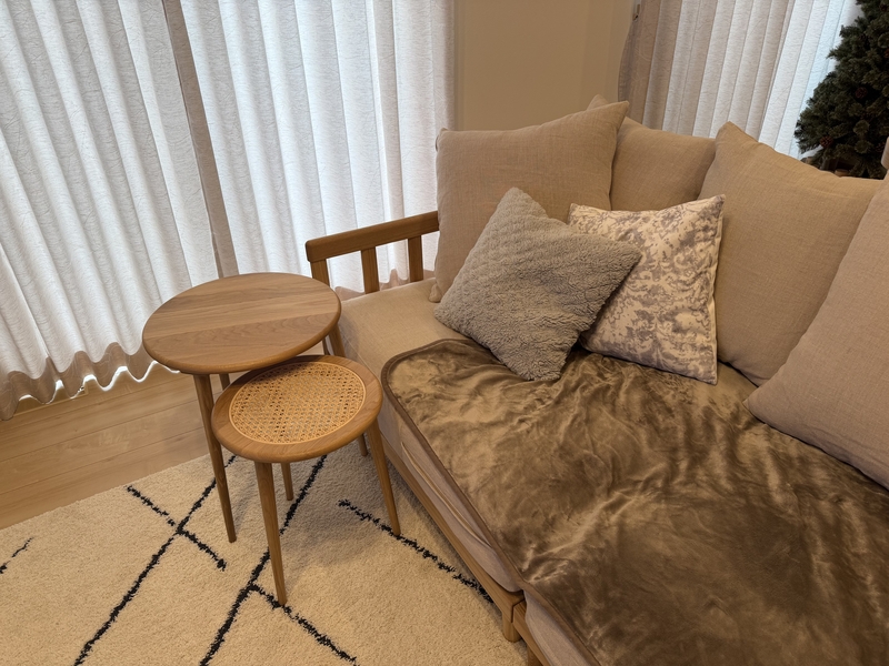 リネン生地をはじめとした明るい色味の生地との相性が良く、ナチュラルなお部屋作りにおすすめです。