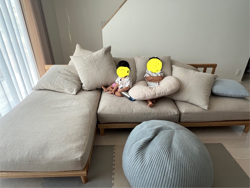 お昼寝もこれまでは子供用布団を和室に敷いていましたが、ソファーが来てからは2人ともアグラソファーの上で寝ています。