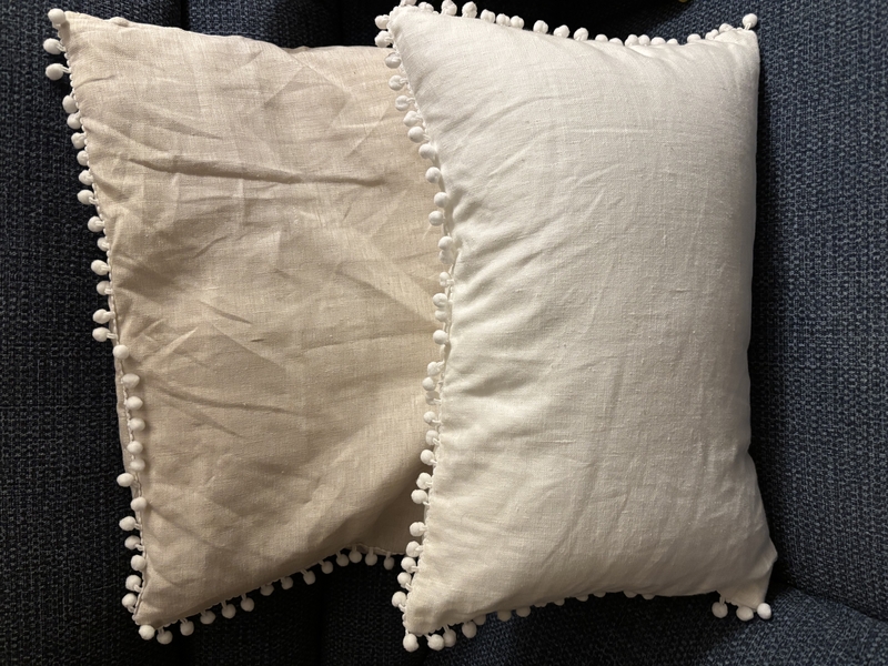 画像上は、ナトゥーラボンボンと、バラバラの素材・色のクッション2つを組み合わせたパターン。まとまりがなく、ちぐはぐな印象を受けます。