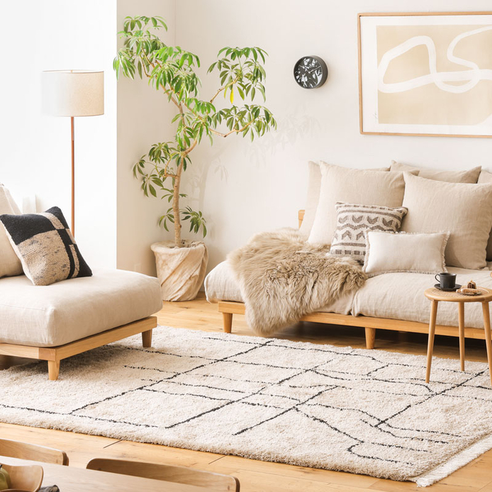 ウールが織りなす幾何学模様は天然の素材感が感じられ、1つ置いているだけで程よい存在感を発揮。ソファーを引き立て豊かな雰囲気を作り出します。