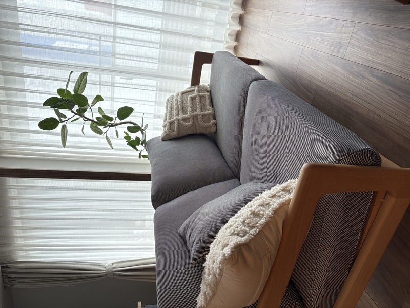 ソファーにクッションを置くとき、リセノでは「左右非対称に置く」ことを推奨しています。そうすることで動きがうまれ、自然とリラックス感のある雰囲気に仕上がりに。