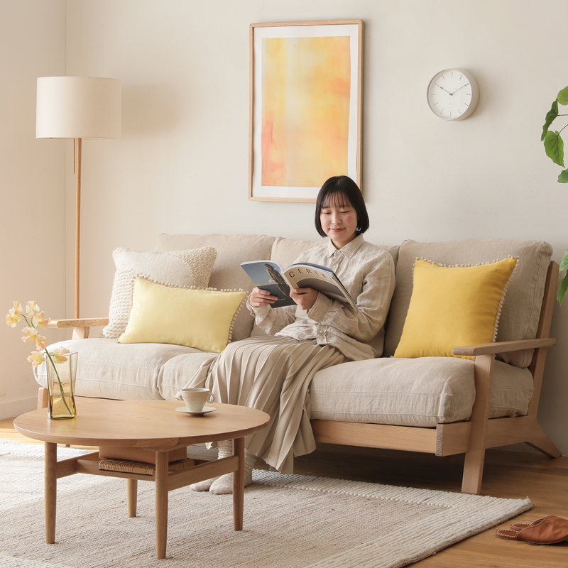 シンプルでナチュラルなソファーに合わせると、メリハリのあるコーディネートに仕上がります。