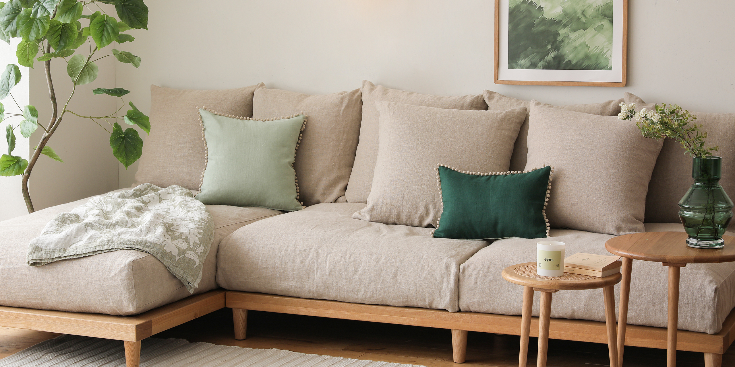 そんなときは、クッションのうち2つを同じシリーズで揃えてみましょう。同じ素材が入るだけで、空間に自然なまとまりが生まれます。