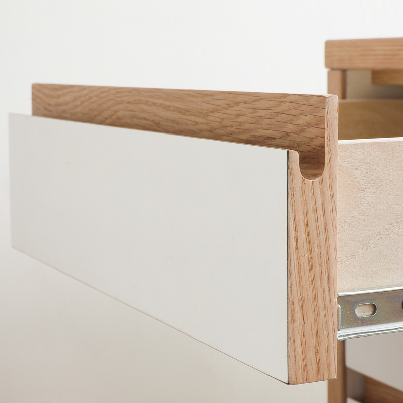 ワゴンを縁取っているオーク無垢材は角を落としているのもポイント。