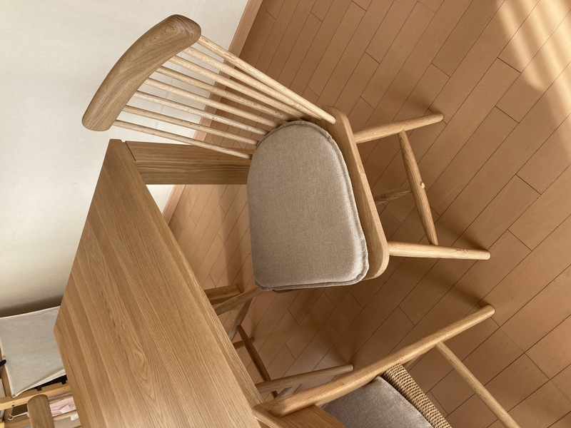 ホワイトオーク材やスポークバックの背もたれなど、見た目の共通点が多いため、違和感なく調和します。
