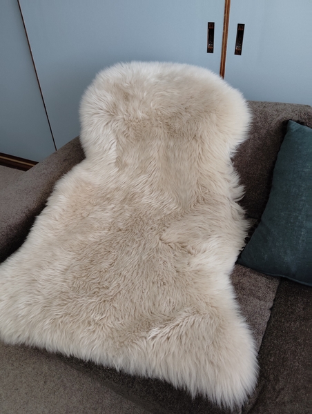 以前ニュージーランドでいただいたシープスキンとは違って柔らかく、ずーっと撫でていられる気持ちよさ。
