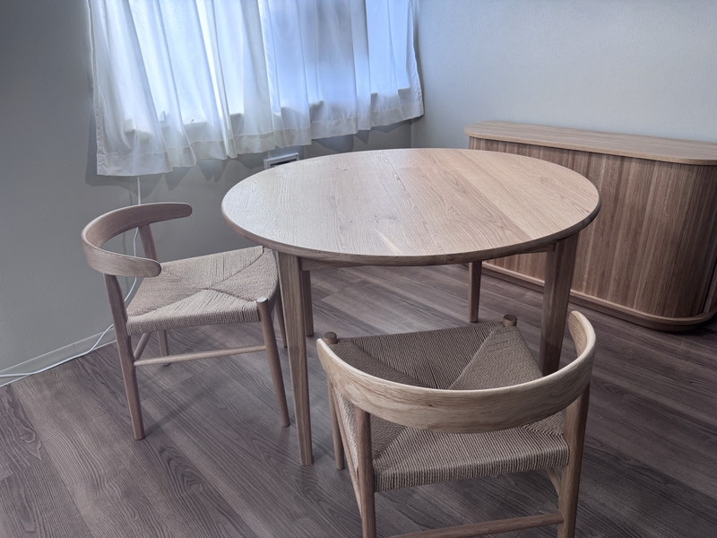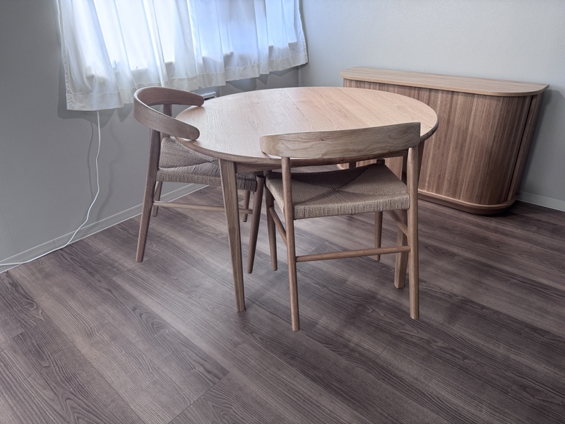 このチェアに使用したのは、オークの無垢材。「folkダイニングテーブル」も同じオーク材ですので、よりデザイン的なフィット感が増しました。