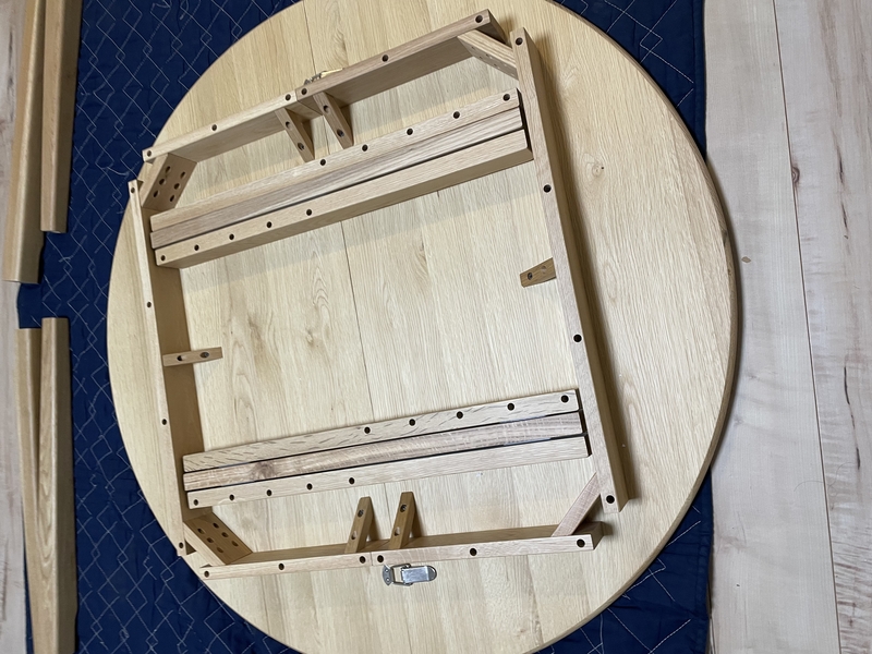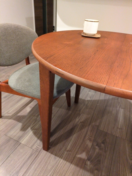 この仕様は、北欧ヴィンテージのダイニングテーブルでよく使われるのですが、大きな特徴として、伸長時に脚の位置も一緒に外側に動きます。