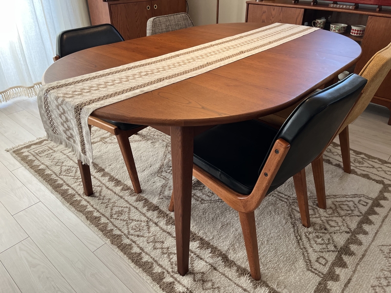 この仕様は、北欧ヴィンテージのダイニングテーブルでよく使われるのですが、大きな特徴として、伸長時に脚の位置も一緒に外側に動きます。
