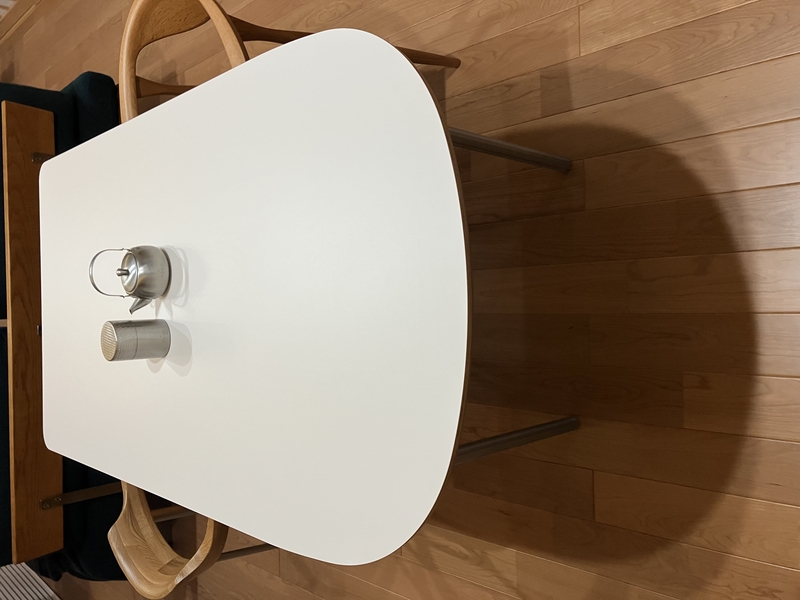 木のあたたかみを抑えたホワイト天板と、線の細いステンレス脚。