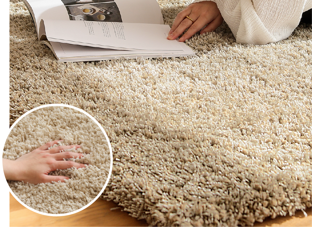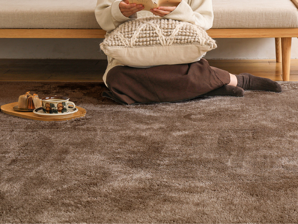 ボリュームのある毛足は、ずっと触っていたいほど心地良い肌触り。底つき感がなく、寝転がってもリラックスして過ごせます。深みある織り糸が、空間に豊かな表情をもたらしてくれます。