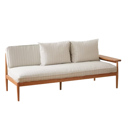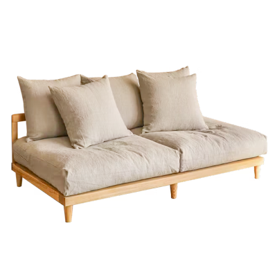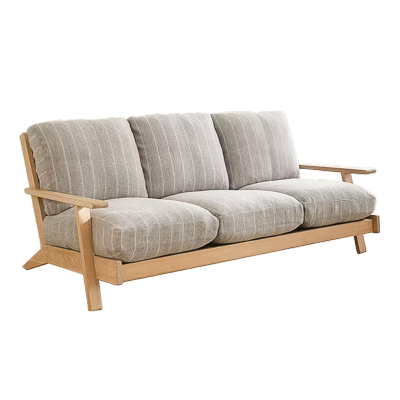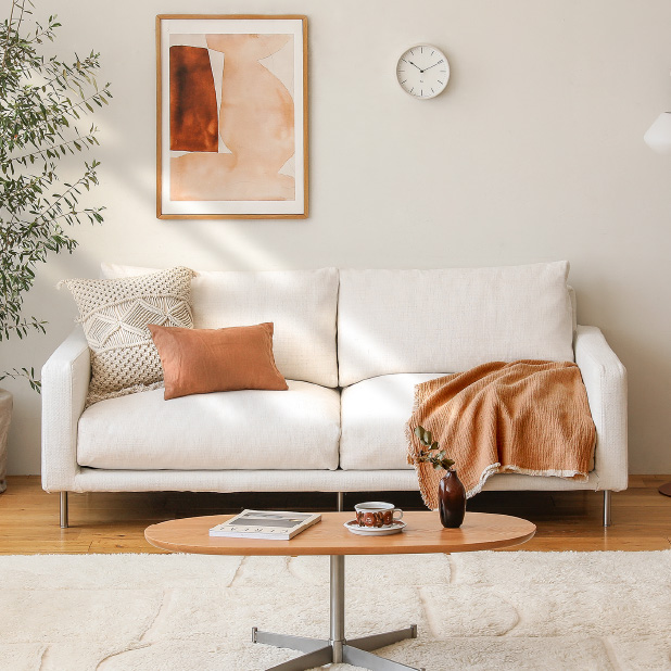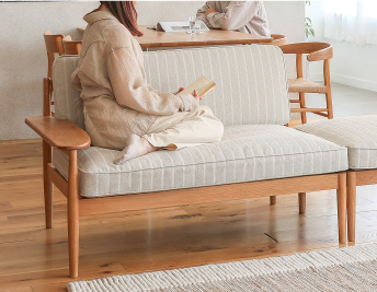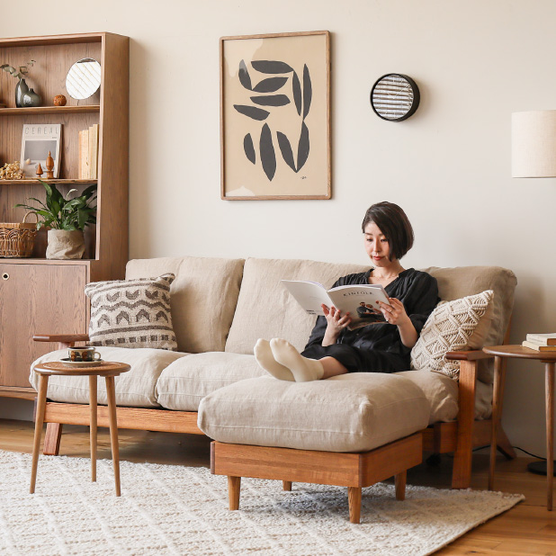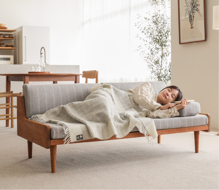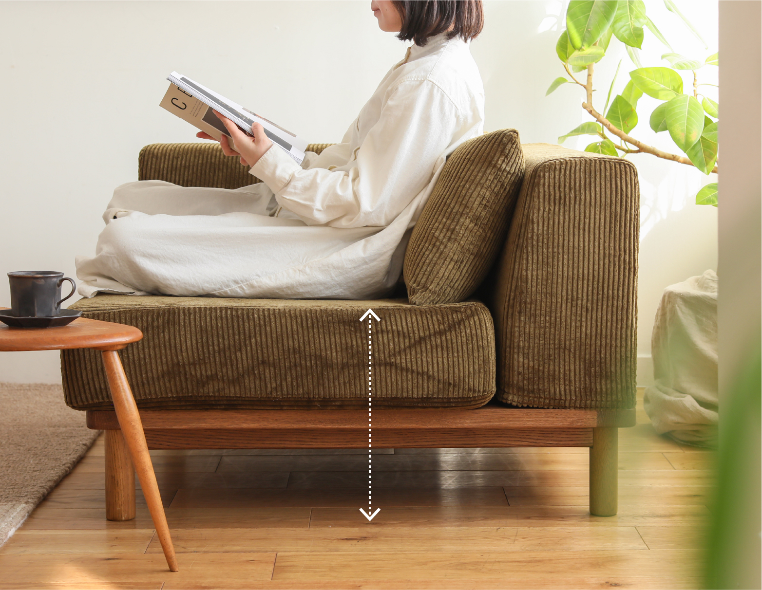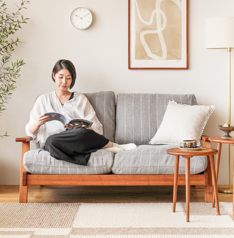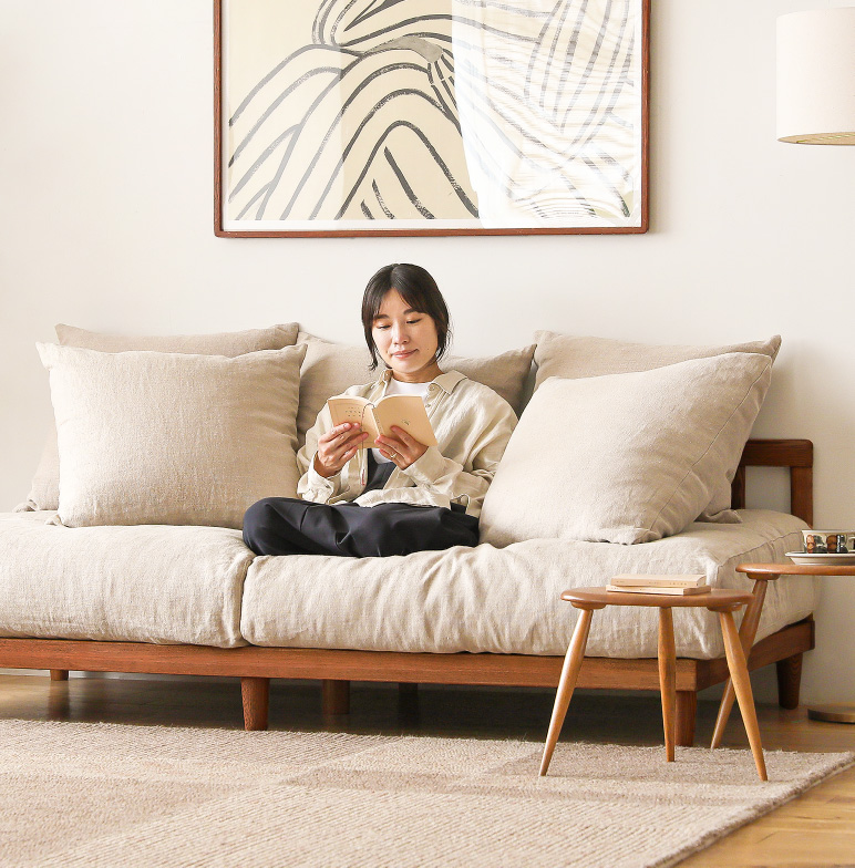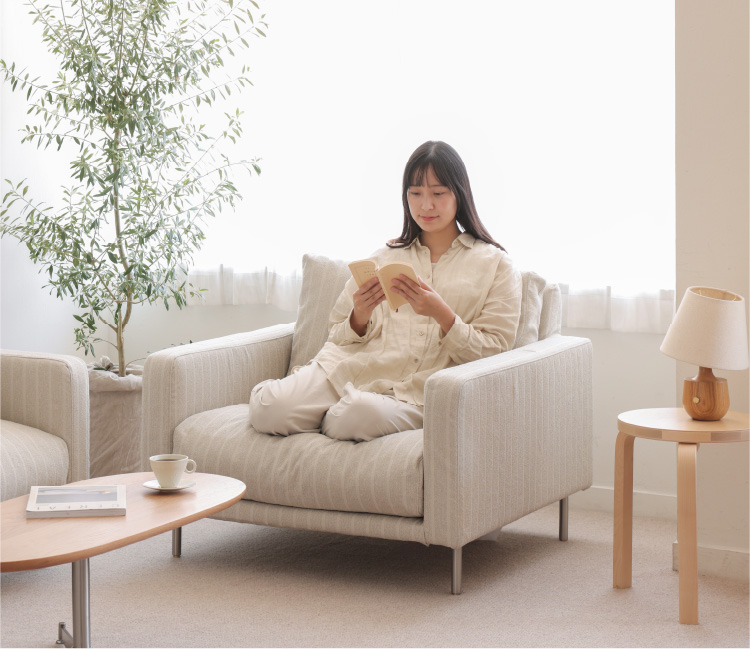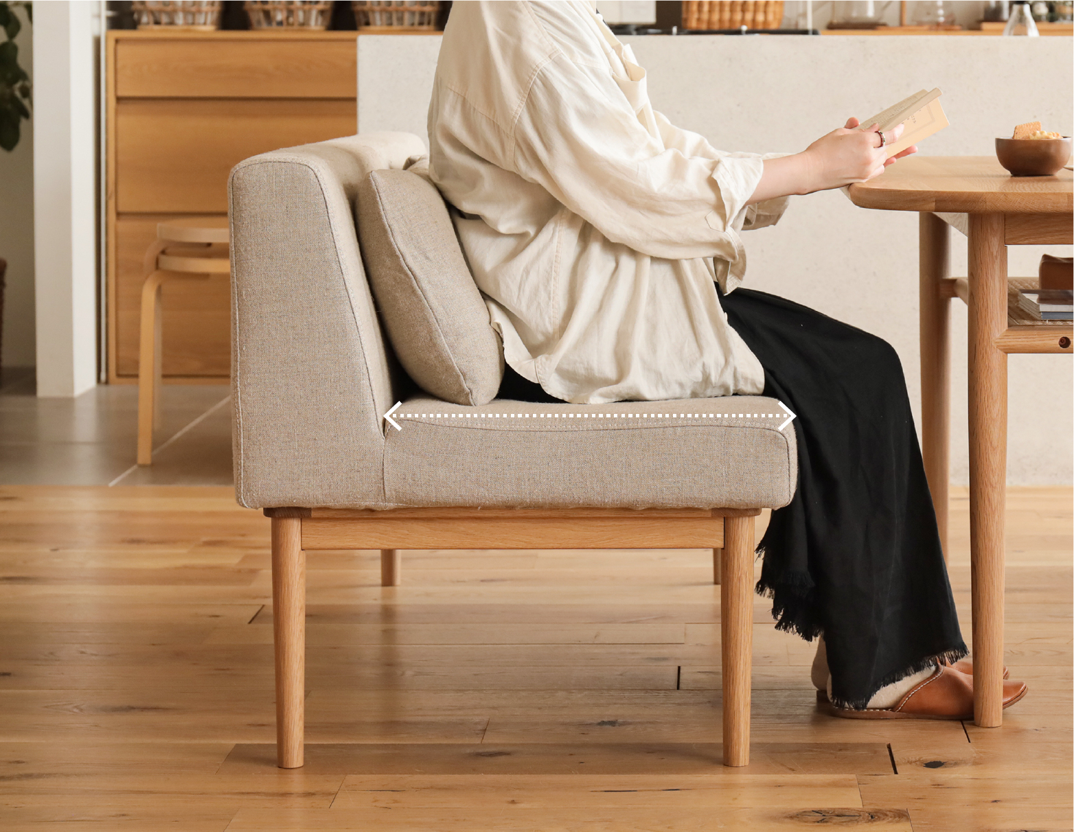 奥行きの狭いソファーは、浅めに腰掛けるため、背筋を自然に保ちやすく、作業や読書の時間にも向いています。座面が浅い分、立ち上がる動作も軽やか。日々の使い勝手の良さにつながります。