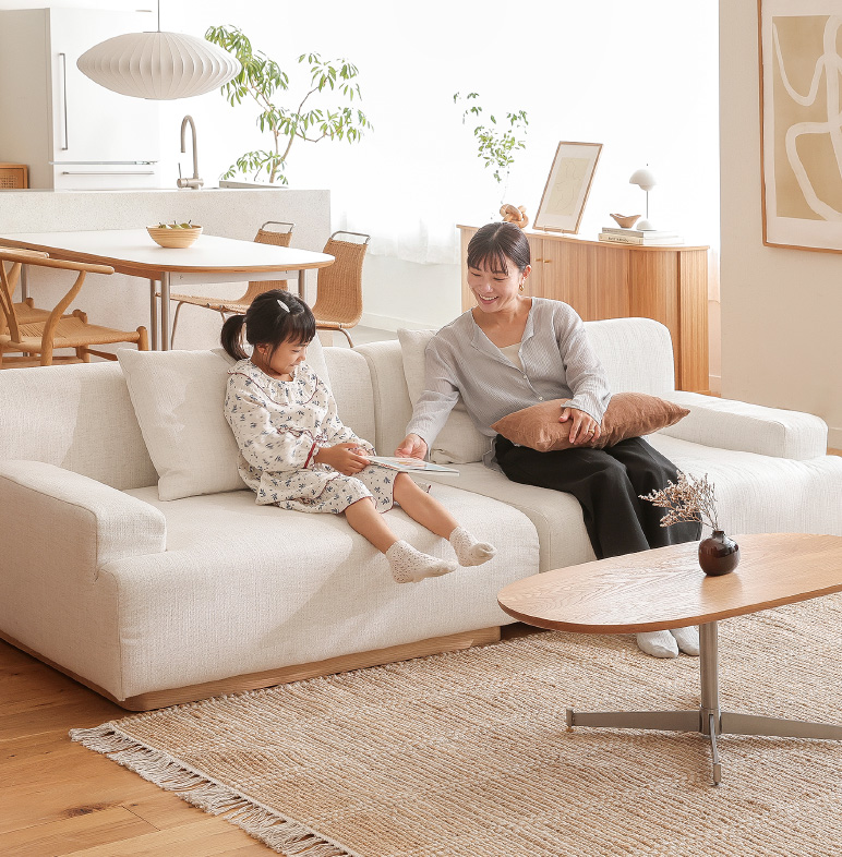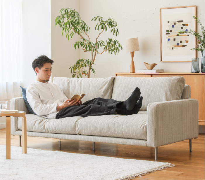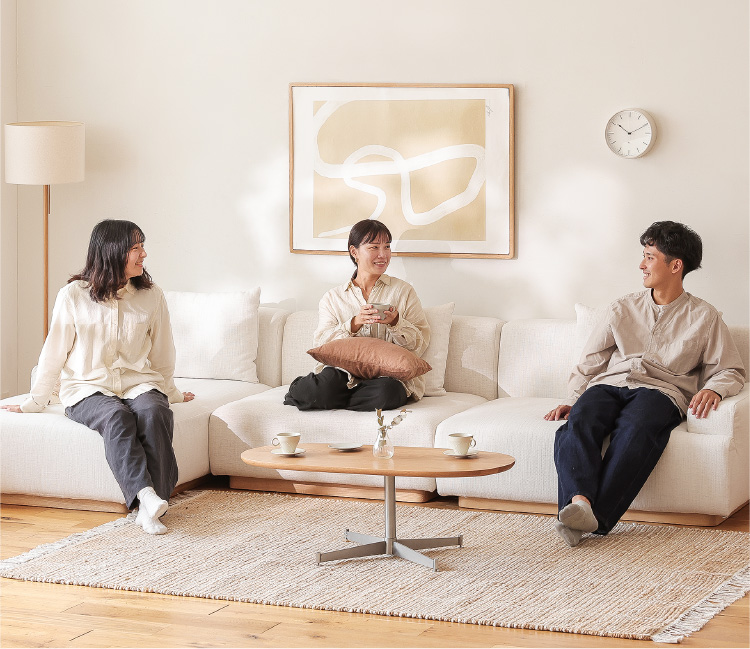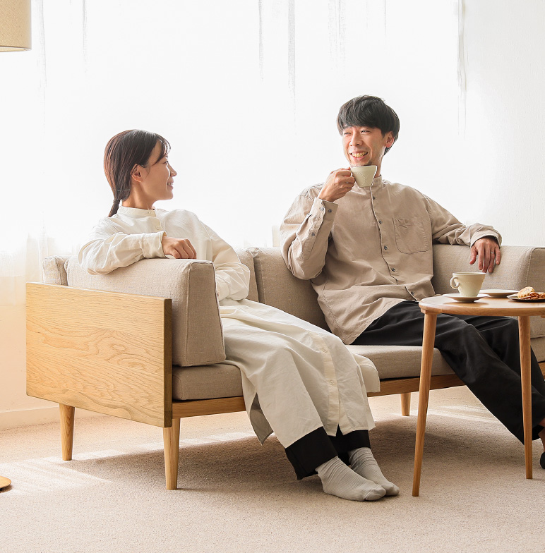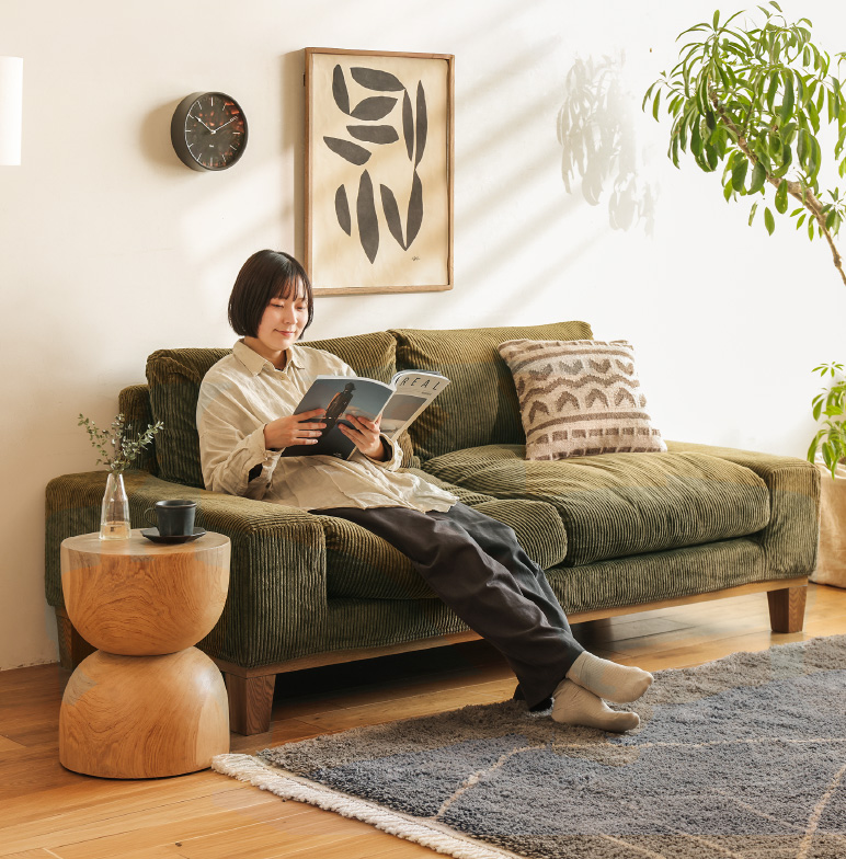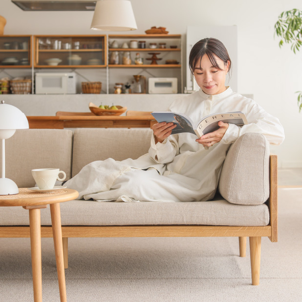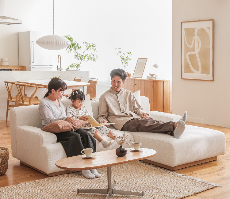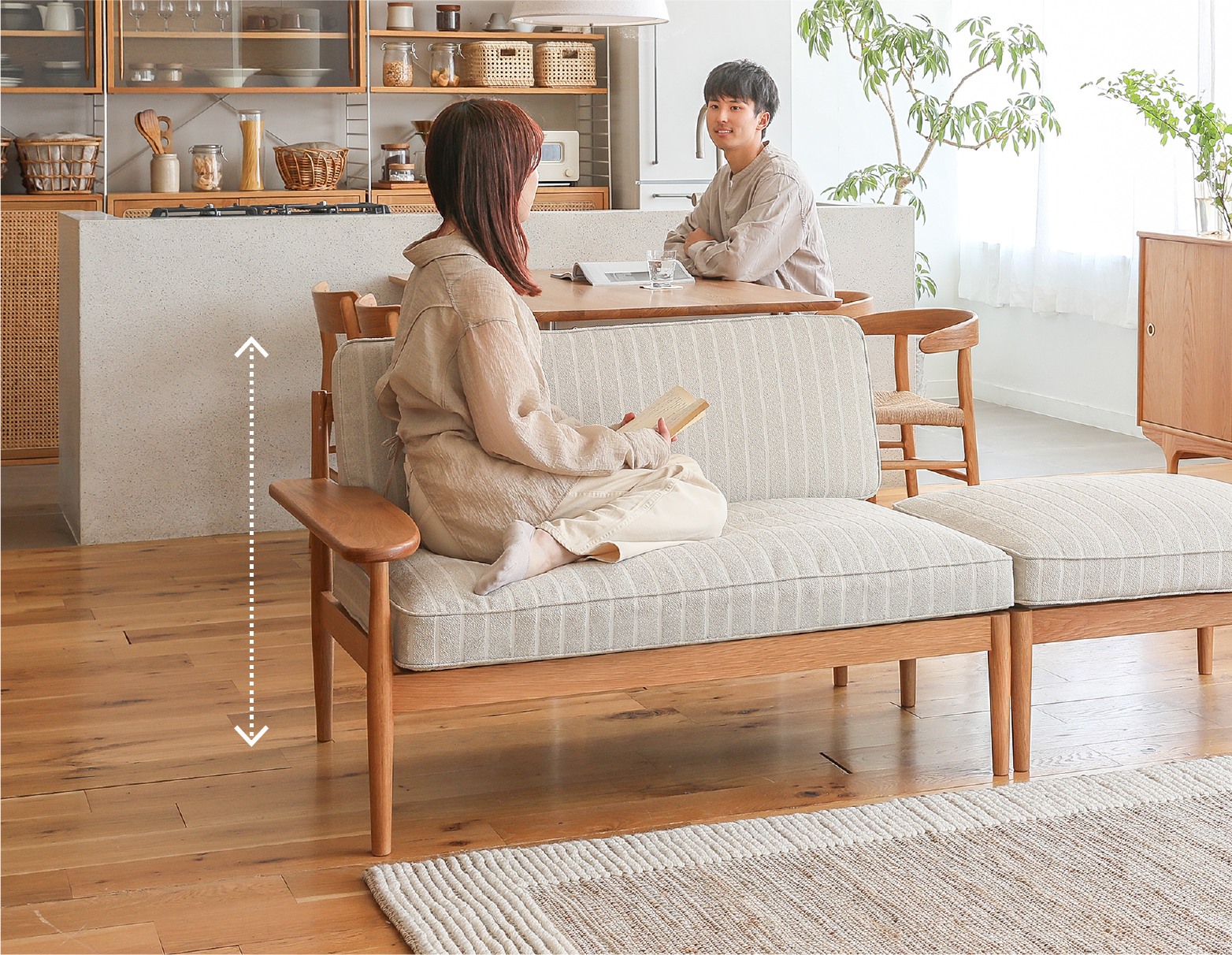 奥行きにゆとりのあるソファーは、深く腰掛けてくつろぎたい方にぴったり。足を上げてゆったり座ったり、お子様を膝に乗せて過ごしたり。家族での団らんの時間にも、やさしく寄り添います。