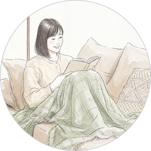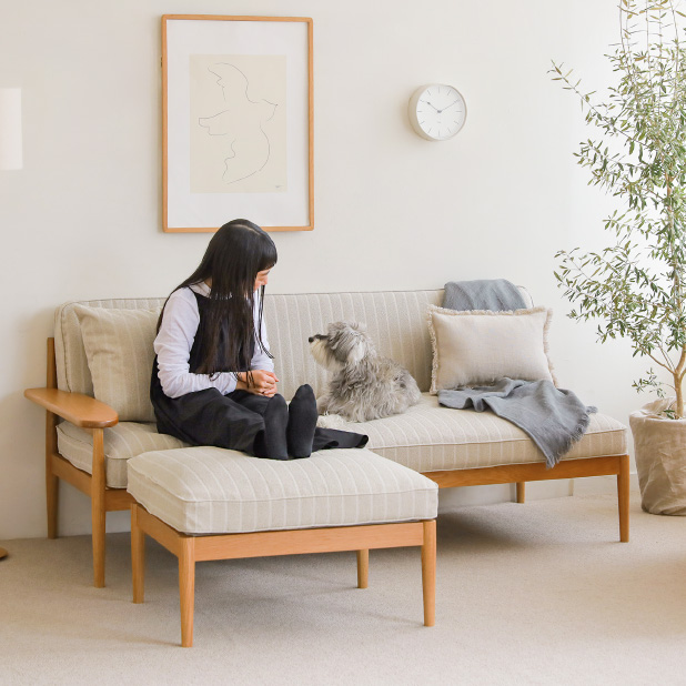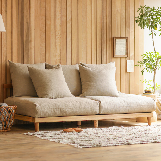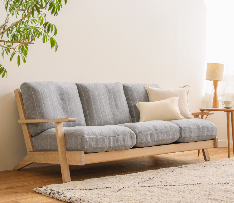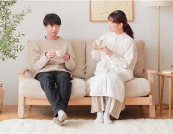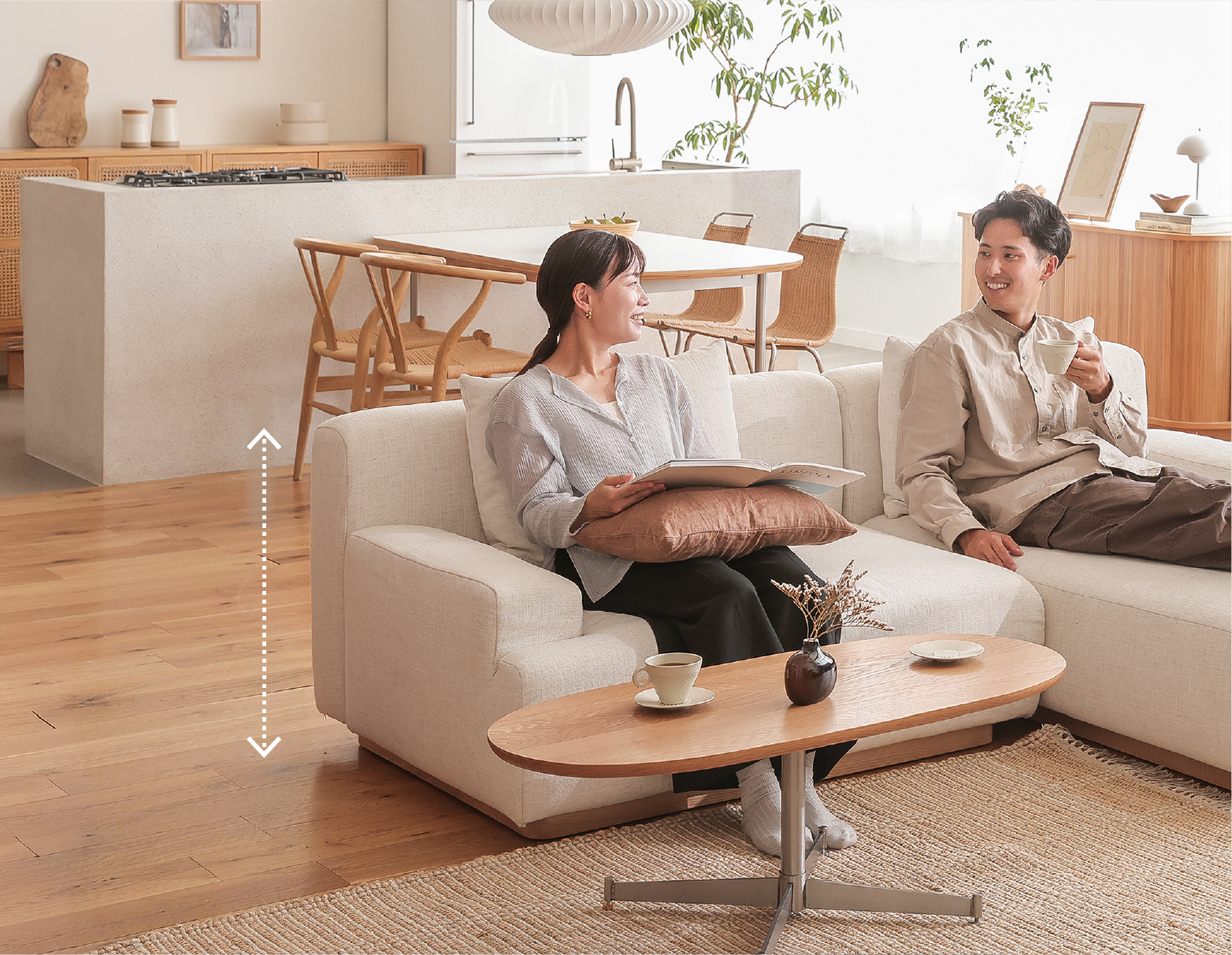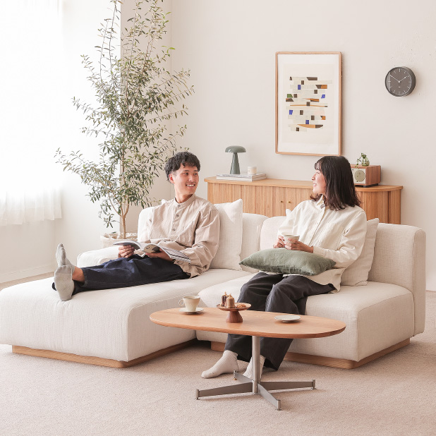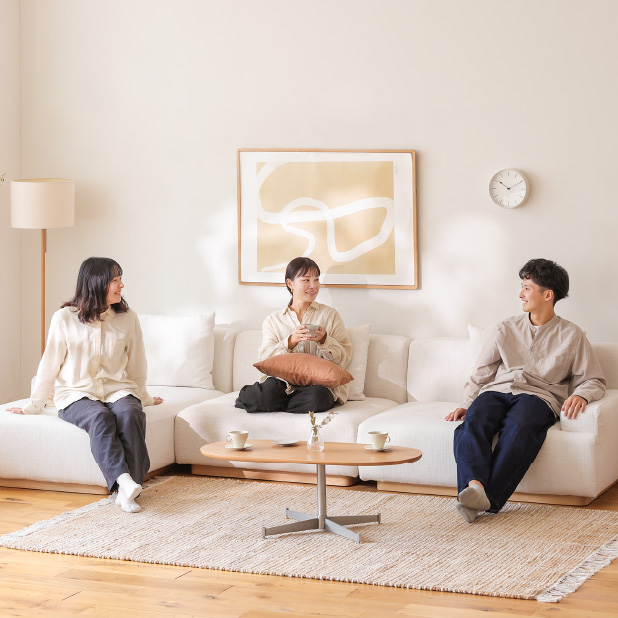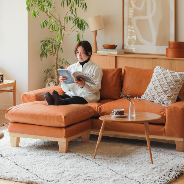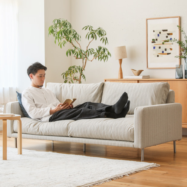 奥行きにゆとりのあるソファーは、深く腰掛けてくつろぎたい方にぴったり。足を上げてゆったり座ったり、お子様を膝に乗せて過ごしたり。家族での団らんの時間にも、やさしく寄り添います。