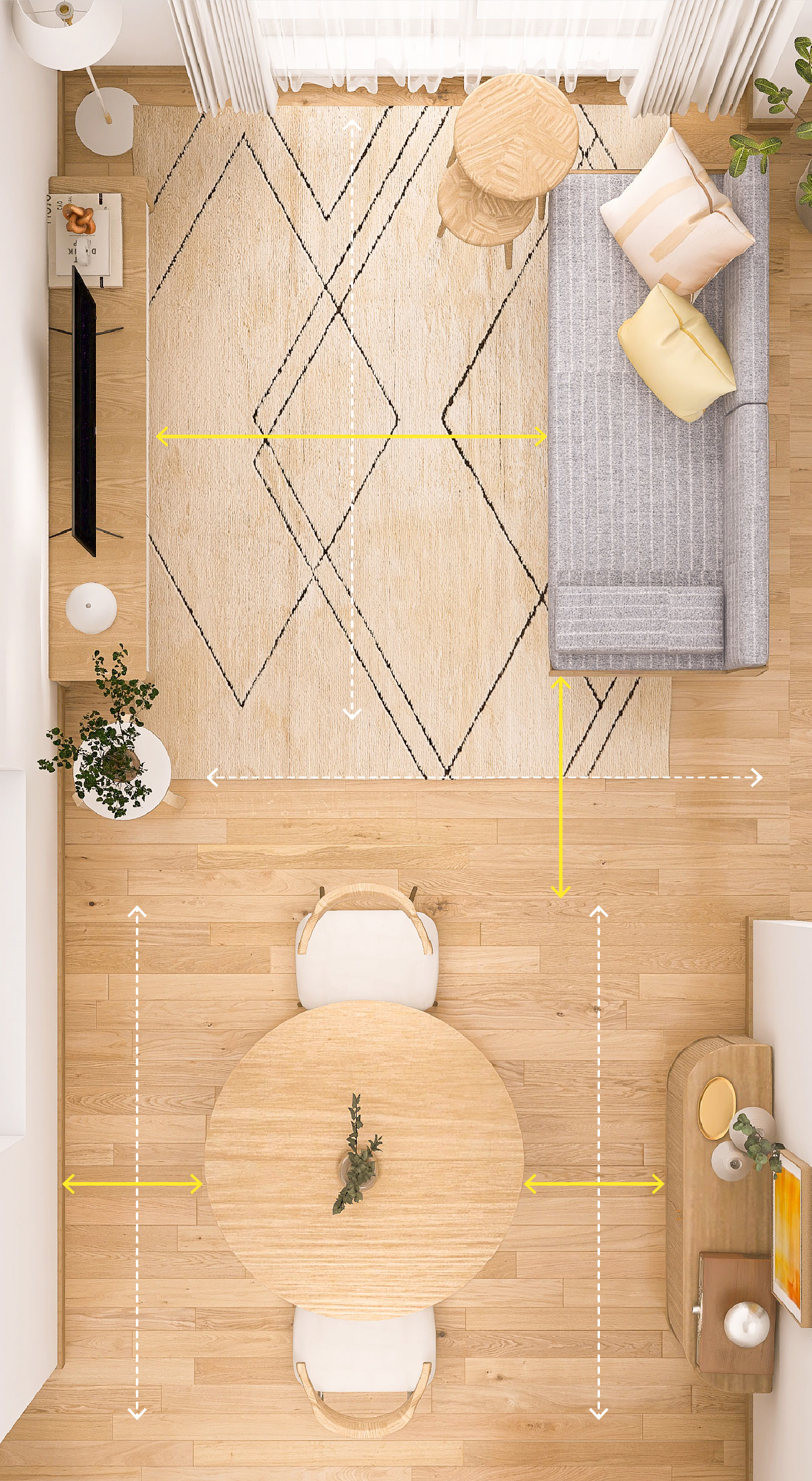 ソファー下にラグを敷くことによって、リビングとダイニングを分けたレイアウト。過ごし方ごとの役割が明確になり、日常にメリハリが生まれます。