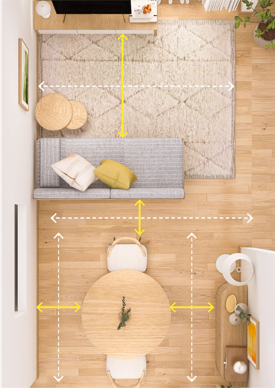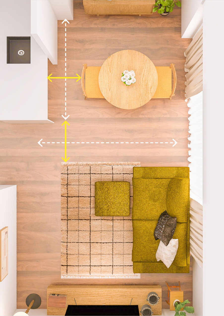 ゆったりくつろぐか、軽く座るくらいかというスタイルを先ず決め、通路などの必要なスペースを計算しましょう。