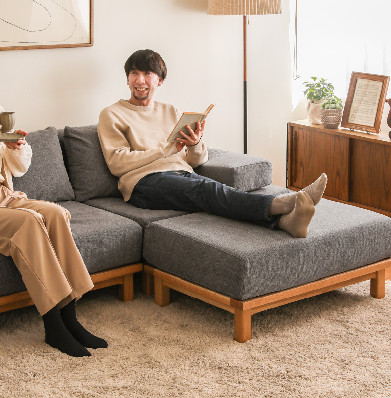 家に帰ったらまずソファーに飛び込んで横になりたい方には、カウチタイプや、アームのないタイプがおすすめ。足を伸ばしてリラックスでき、より一層くつろぎの時間を楽しめます。