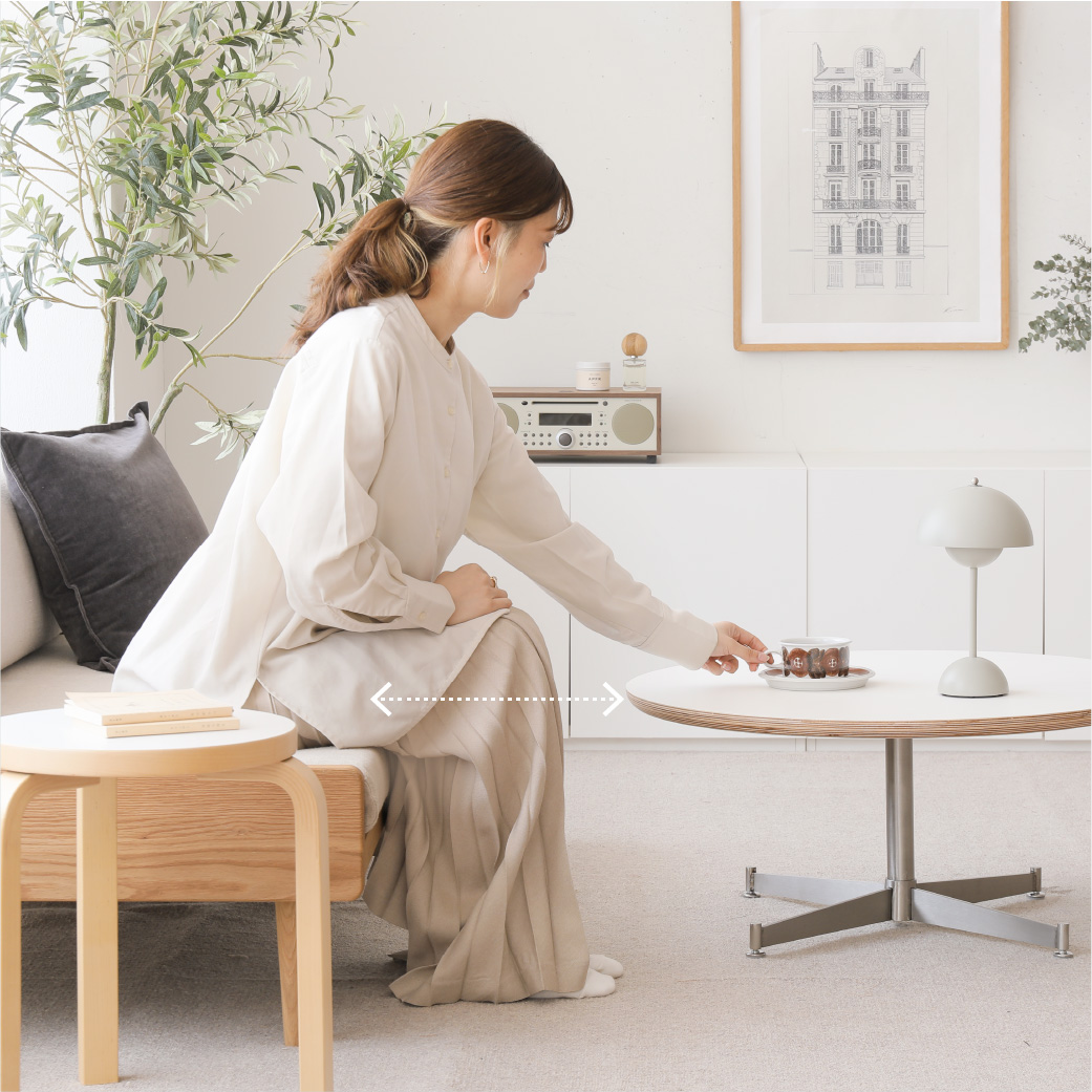 浅く腰掛けるタイプのソファーの場合、テーブルとソファーの間は、本やコップも取りやすい、35~45cmのスペースが良いでしょう。