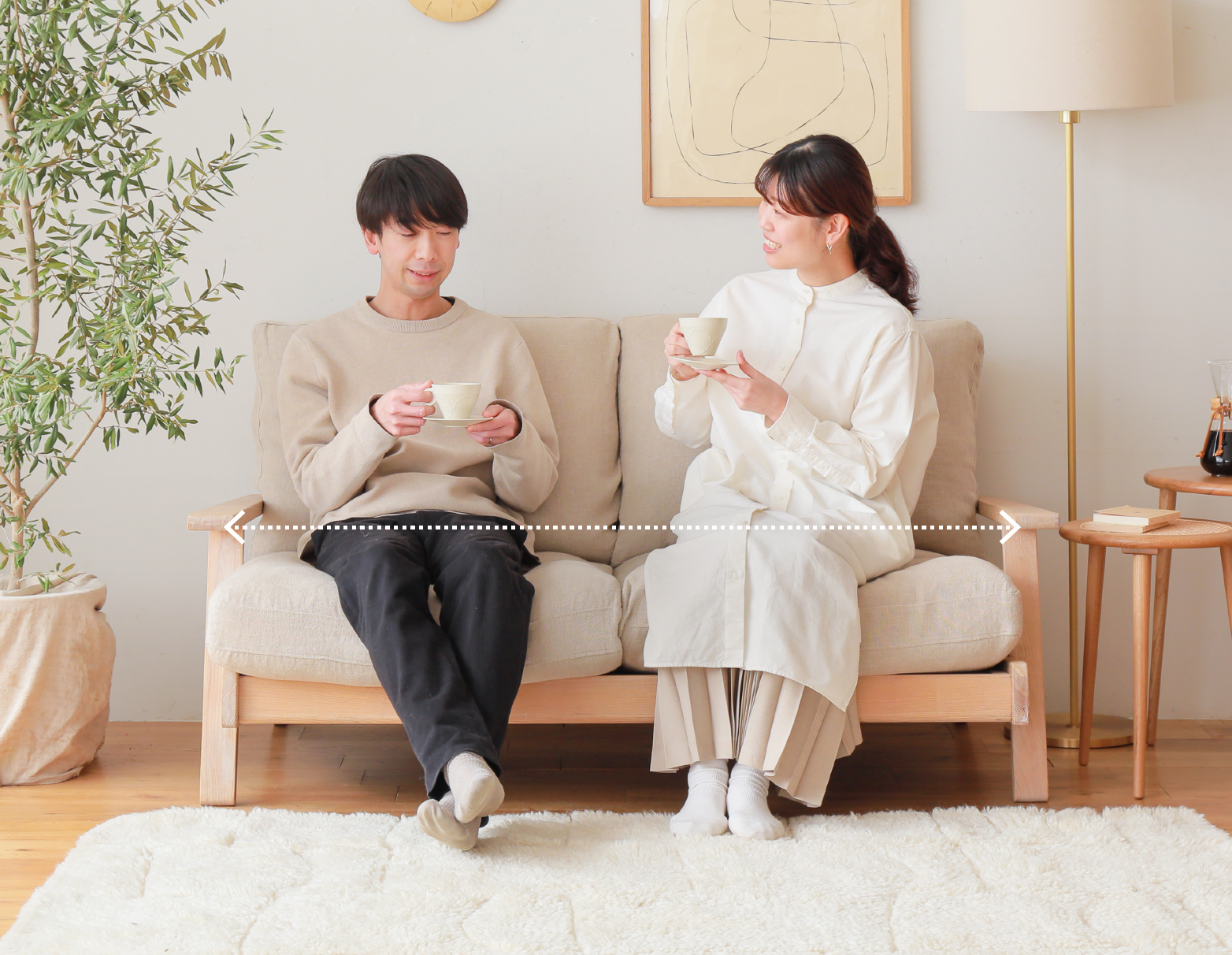 座面幅120cm以上のソファーは、1人あたりのペースが広く使えるので、パートナーや友人とリラックスして会話を楽しむことができます。