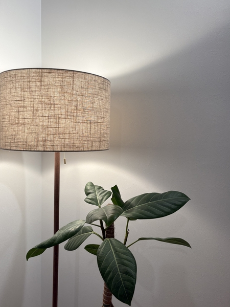 フロアライト「HEMPLEN(ヘンプレン)」はファブリック、ウッド、真鍮パーツを合わせた照明。ホテルでよく見るような定番のフォルムで、凹凸のないシルエットは無駄がなく、とてもシンプルです。