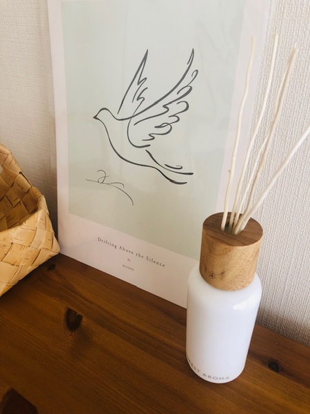 こちらでは、アロマディフィーザーのネックカバーとポスターフレームで、「木」の素材を揃えてディスプレイしています。さらに、ディフューザーのボトルとポスターで、「白」のカラーも揃えています。