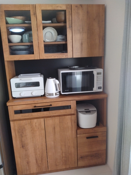 棚は高さも調節できるため収納力もよく、こちらの食器棚一つで一人暮らし分の食器、家電、ストック類も収納することが出来て良かったです。