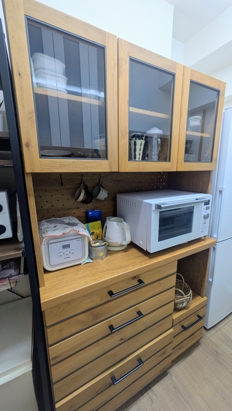 食器や小物を飾ったりできるガラス戸棚に、家電やよく使うアイテムを置いておけるオープンカウンター。そしてカトラリーや食材をまとめられる引き出しと、「見せる」と「隠す」を便利に使い分けられるようになっています。