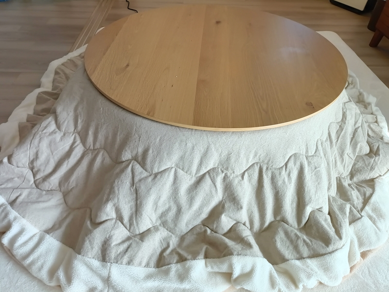 また角がない分、同じサイズのこたつテーブルに比べて周辺が歩きやすいというポイントも。大きさの割に動線を邪魔しないので意外と取り入れやすいです。