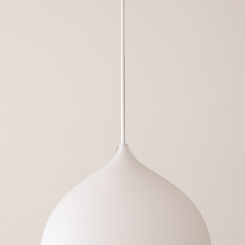 マットな質感の乳白ガラスがダイニングにしっとり溶け込み、静かな存在感を放ちます。