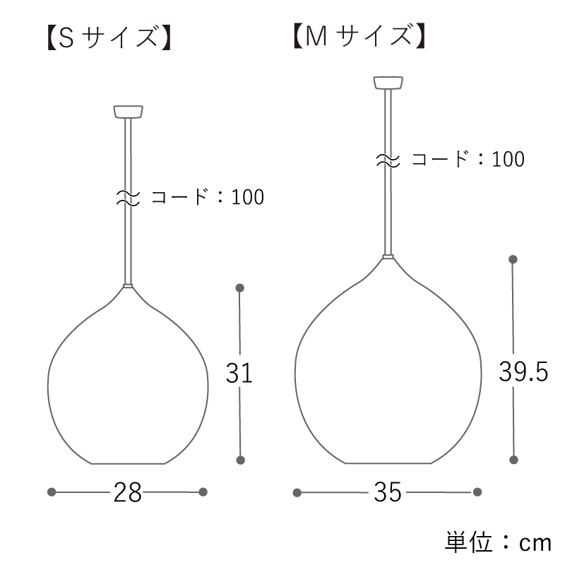 サイズは、お部屋の広さやテーブルサイズに合わせて選んでいただけるよう「Mサイズ(直径35cm)」と「Sサイズ(直径28cm)」の2種類をご用意しました。