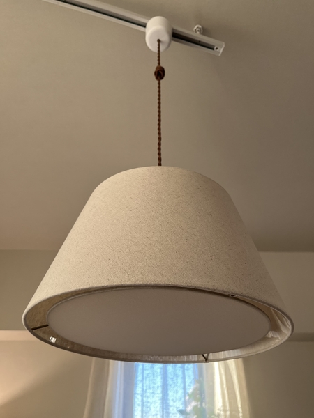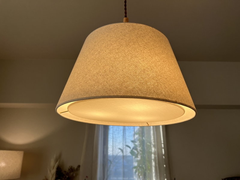 とてもベーシックな形状で、トラディショナルともいえる今回のペンダントライトですが、素敵な生地を採用できたことで、柔らかな光を与えてくれました。