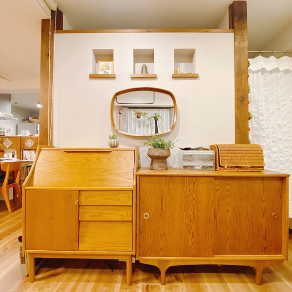 リビングでは、シェルフの上に横向きで立てかけておくことで、雑貨としてコーディネートしながら、ドレッサーのようにお使い頂くことができます。