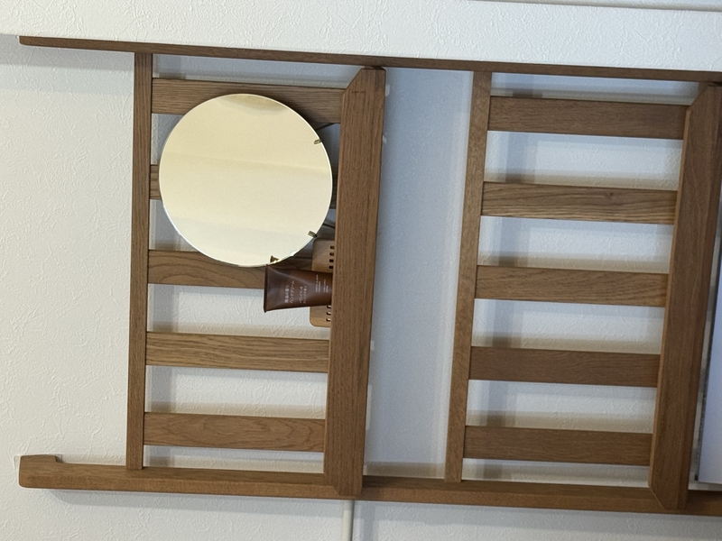 壁に立てかけるタイプのシェルフに置きたくて、かなり悩んだ挙句、こちらを選びました。置ける部分が細いのですが、スタンドを縦の木の隙間から後ろにはみ出させることで置くことができました。