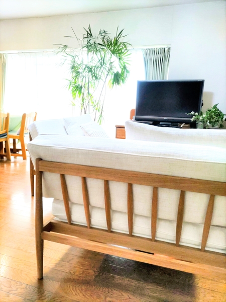 日頃は主人と一脚ずつくつろいで座っていますが、お客の時には一脚に2人普通に座っていただけます。
