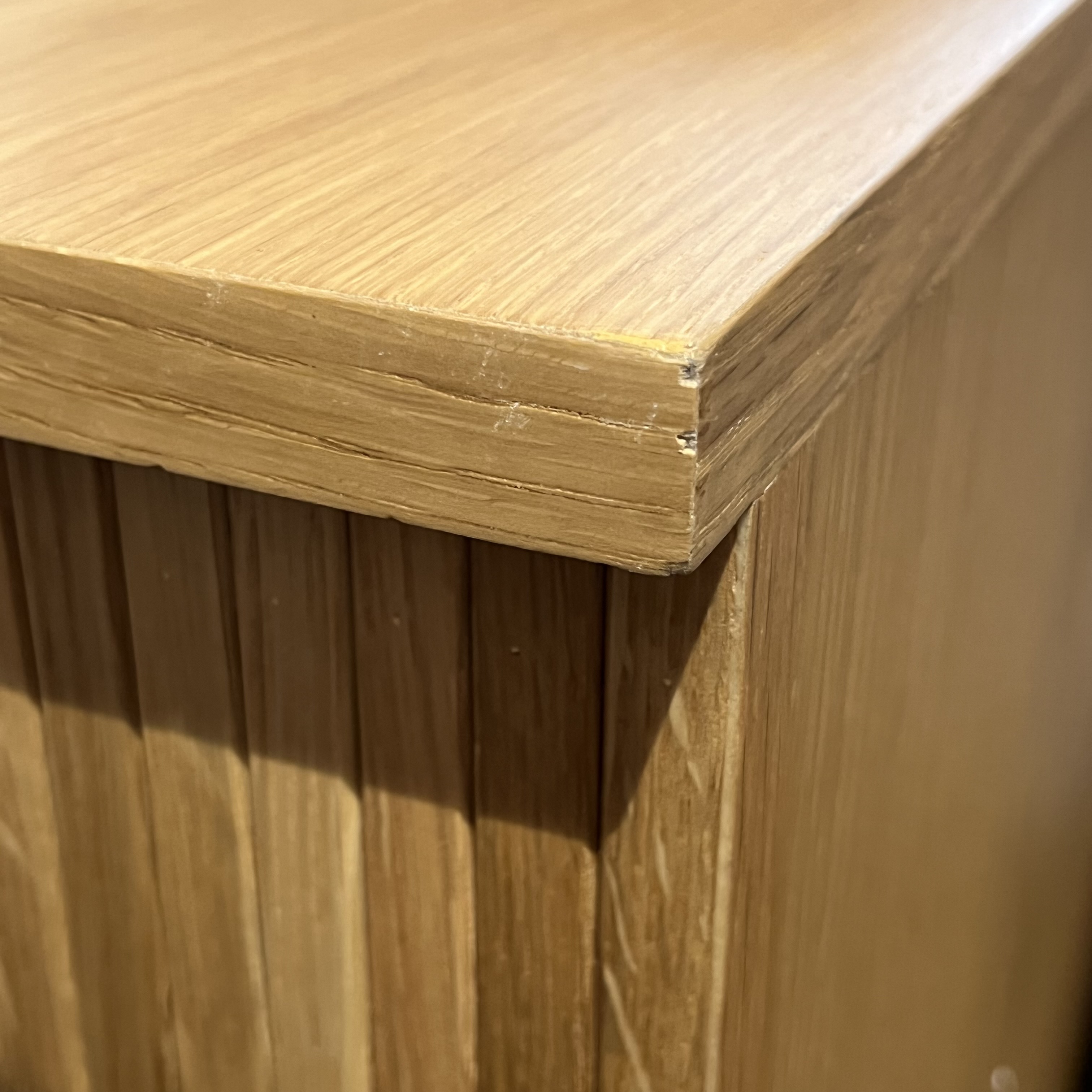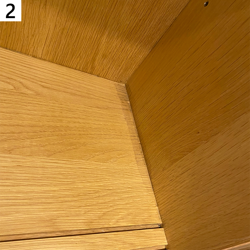天板塗膜の擦り傷、テカリあり、扉締め切ったときに、中央上部隙間あり |