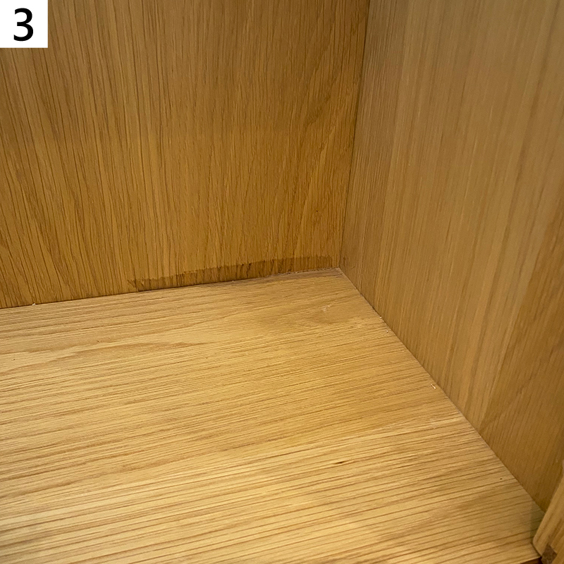 左右収納内側に汚れ、天板・収納棚小汚れ共に補修・仕様に影響なし |