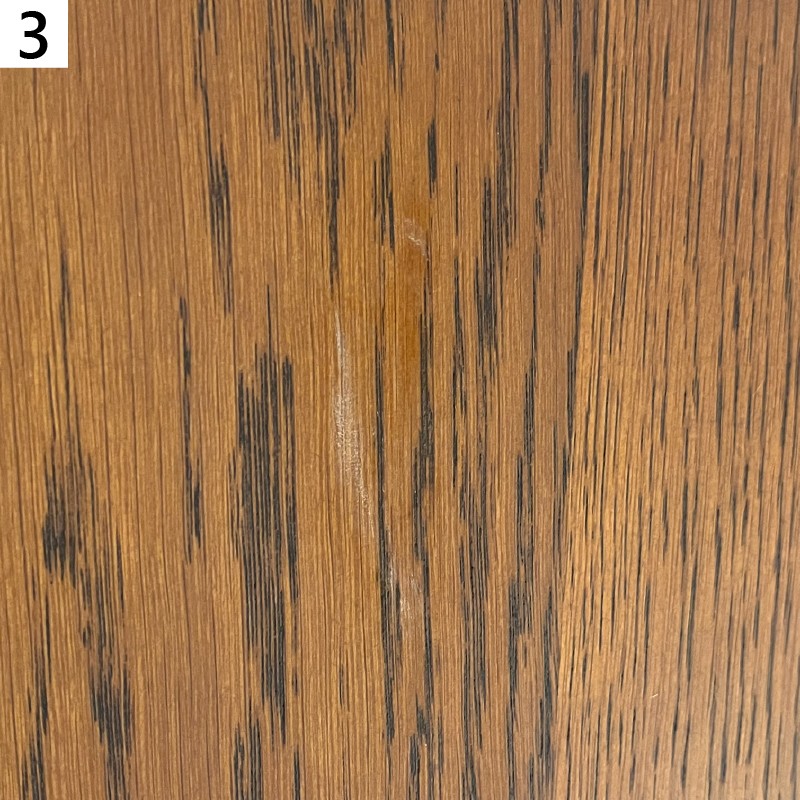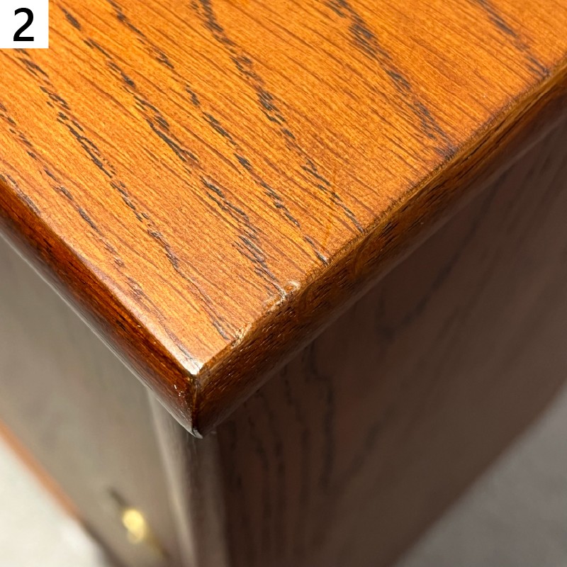 天板擦り傷あり、天板右角打痕あり、棚板一枚キズあり、中扉塗料白化・補修跡のテカリあり。 |